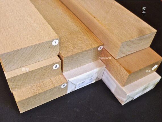 ・A. 平台鉋用 白樫(追柾・板目平柾): 幅 100-90mm / 厚み 45-39mm / 長さ 305- 300mm