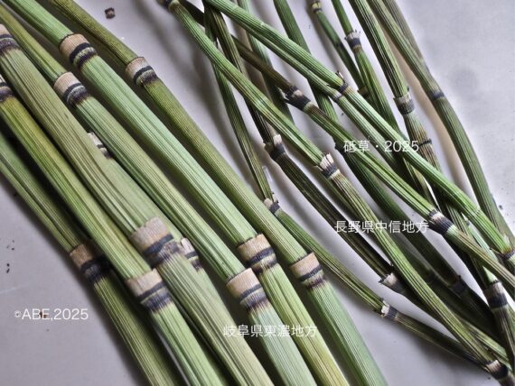 表面の白い斑点は、地中のケイ酸を吸収して付着したもの_土中のミネラルケイ酸を吸収して微細なザラメとなり、影干しして茎を開き、この表皮を研磨材として使います。古代から使われている有用な資源植物です。
