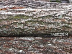 47ー57年輪の目詰まり材_産出地は長野県北部, 幹の曲がりあり。年輪径断面の楕円から斜面の林地と判断。木口を観ると樹芯から初期成長が肥大しているので自然林木ではなく庭木か屋敷林?また、元木も根元すれすれで平伐りしているので更地にするための伐り方です。年輪幅も順当で日当たり・生育環境がよいことが判ります。