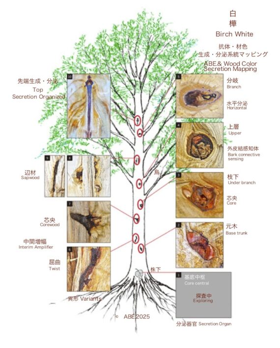 キコリの親方・学者も気絶する白樺樹体内機能_有機酸をアルカリに変え、清浄な樹性・美質を造り出し、生成分泌質量はどのように顕れるのか? |The secretion organ to produce anti-blastic substances and wood color with clean and aesthetic qualities in Birch White. By mapping, systematic organization of life-sustaining was appeared.|見えない生命維持構造をマッピングで明らかに 木の内科-138