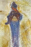 リトマス呈色反応の逆色相ですが、自然界のカラフルな分泌シーンは材面のカットで観察でき、数時間で色相が暗褐色に移ります。液状分泌吐出が鮮明です。
