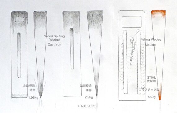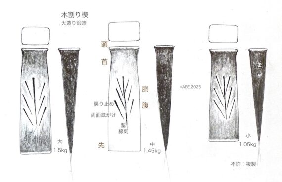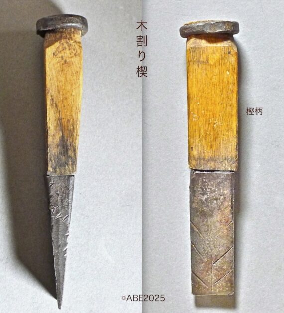 原木割り、杣キコリ・炭焼きには必需工具でした。大径木がなくなり、通直でない癖木がふえるのでチエーンソー挽きしますが、本来は、木成り・育ちや材質の木理目通りをみることができる役物。古代から20世紀末まで、歴史の裏道にあった棒屋・鍛冶屋の定番でした。中世から近世には、刃口がにている両刃の割鑿が使われましたが、厚く頑強な造りでないと衝撃には耐えきれず、鋭利な鑿の代用にはなりません。