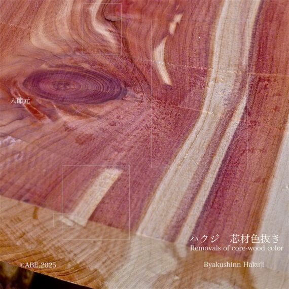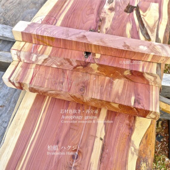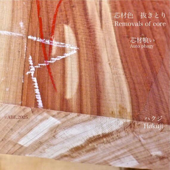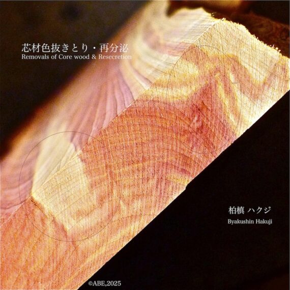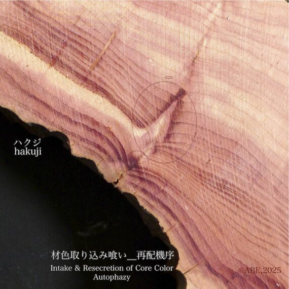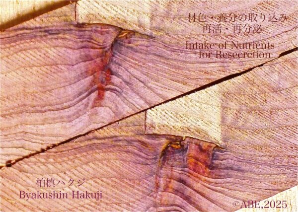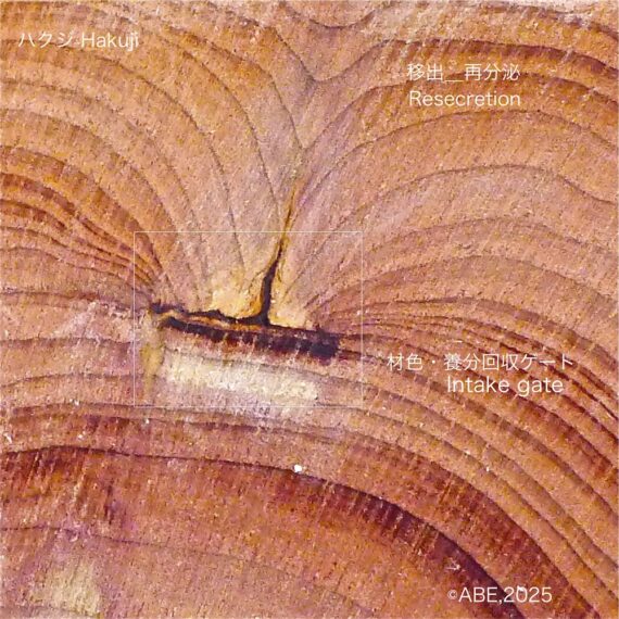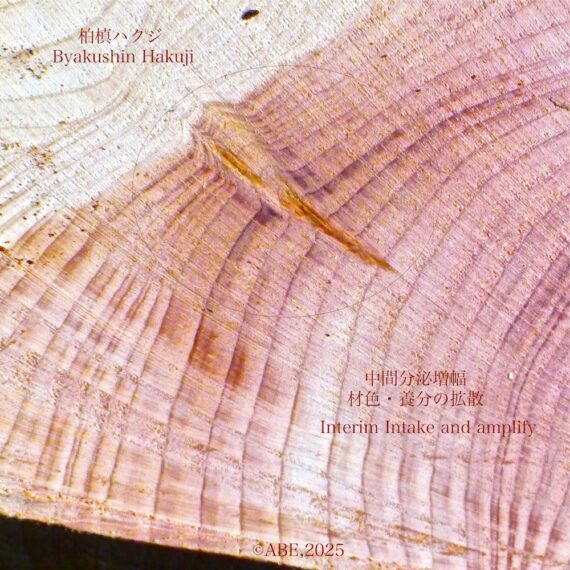 木の総合学研究 2025 「常緑針葉樹柏槙ハクジの材色の生成分泌、再配による生命維持能力アップ」「芯材色の動きに現れる年輪木理の変容造り替え・再活性化」「材色・抗体・養分を取り込み、供給する再分泌スイッチングゲート」