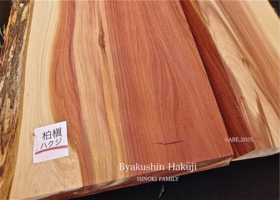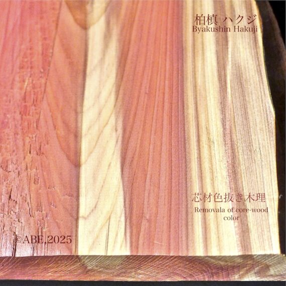 中信地方の方言「ハクジ」は、芯材色が部分的に抜けたマダラ木理を端的に表現しています。学名「柏槙」ビャクシンは、葉枝・樹皮の外形由来の命名なので木の内科的命名がピッタリ。