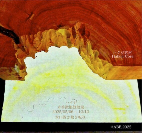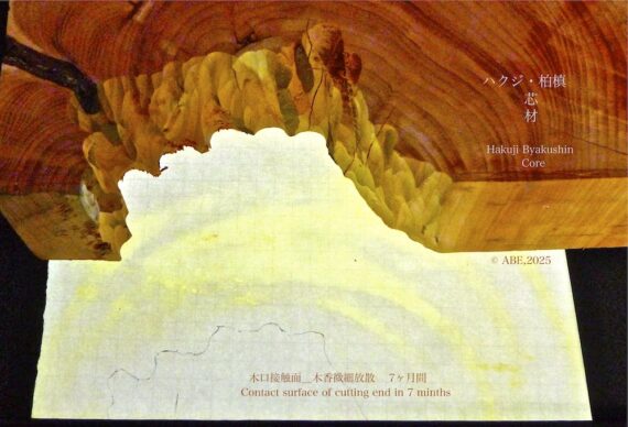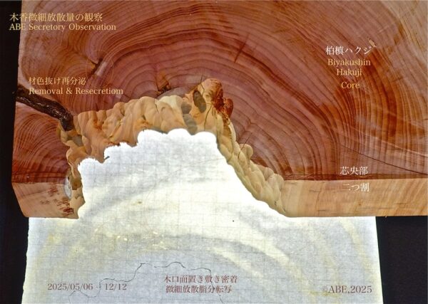 芯材色・養分を抜きとり、新規辺材部へ融通する柏槙ハクジの自喰い再活ダイナミックス_木香キガ成分の木口微細放散量検出・可視化の試み|The removals of core-color by autophagy and resecretory accommodation in Biyakushin Hakuji, intaking saved nutrients and excuding wood fregrants from cutting end.|再配機序_見えない・知らないことを明らかに 木の内科 -140続