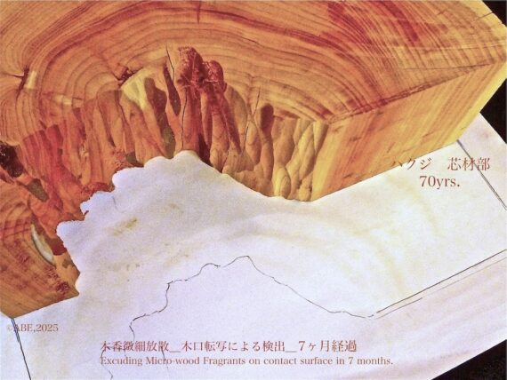 木の総合学研究 2025 「常緑針葉樹柏槙ハクジの材色の生成分泌、再配による生命維持能力アップ」「芯材色の動きに現れる年輪木理の色変動・再活性化」 「木香の分泌精油成分と微細放散質量」