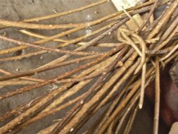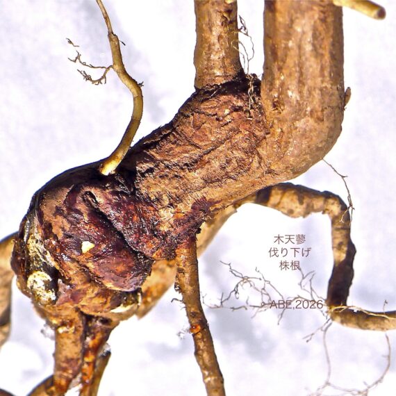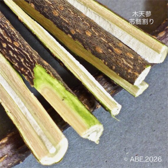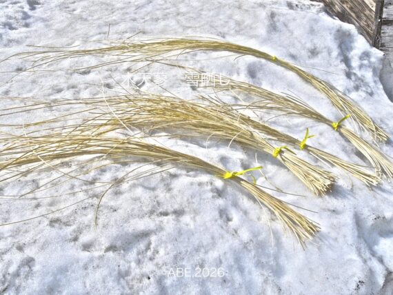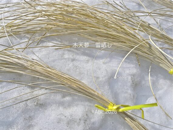 木天蓼マタタビ(サルナシ科)落葉蔓性木本_初冬に台木枝元を伐りとり。割り裂き、雪上天日晒し、籖ヒゴに成形。