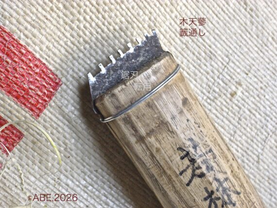 「籖通し」挽きこそげ削り_道具仕立は、定寸間隔のコバ・際とりですが、鍛造鋼刃のもつ潜性を巧みに再利用した自作道具です。真髄の抉りは突き浚い刃で、目研ぎは、摺込み鑢により縦刃研ぎ。鍛冶屋が打つ山林鋸地金は、刃の厚みがあり、造り変えることができる。高度経済成長期以前、会津地方には、上質な鋸・鉋刃・鑯セン・包丁の鍛造諸職が活躍していました。