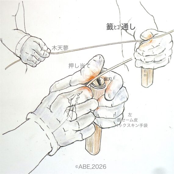 厚みがある山林用鋸刃は、切刃が立ち、間隔がすいているのでヒゴの幅決め、左右立刃で木端を脇取り、定幅のヒゴを削ります。指当て押し削りは、ヒゴの性状を読み取り、微妙な感覚で整えます。