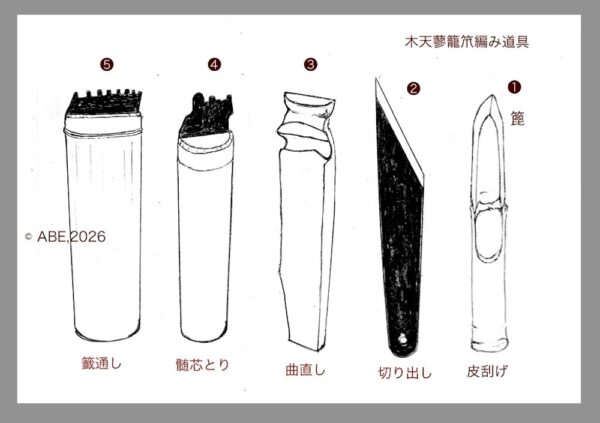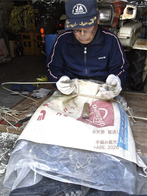 雪国山里の暮らしに伝承されてきた木天蓼マタタビ籠笊編み|By the remakes of forged saw blade, silver vine basketry weaving handed down of rural mountain village in snow country OKUAIZU. |鍛造鋸刃を造り替え、割り裂き、籖ヒゴ通しの自作道具・工人若林清一の手練編み技 木の内科-141続 / ハンドツールジャパン -75