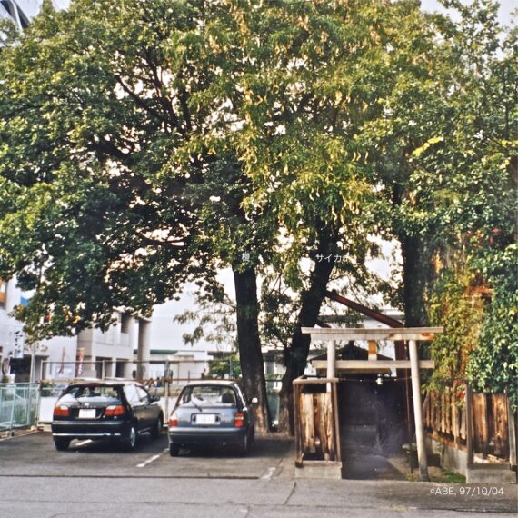 1997 年10月更地・パーキングに改造され、稲荷祠とともに残されましたが、その後、都市計画道路で削られて公園に分離され、現在に至りました。撮影開始当時、樹勢は良く、サイカチが隣家の屋根に伸びて傾くため、稲荷祠わきから斜めに鉄骨支柱がはいっています。